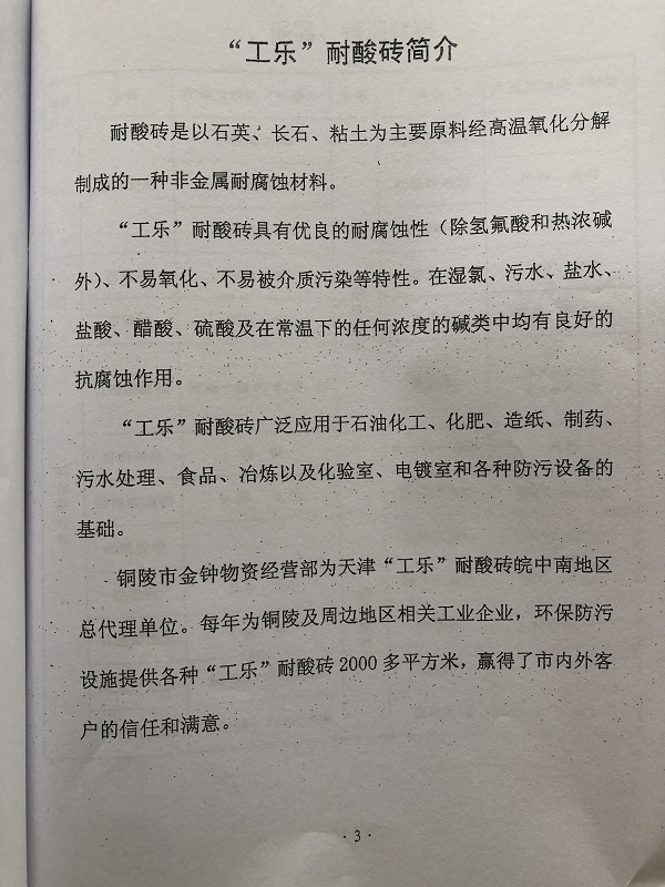 “工樂”耐酸磚簡介耐酸磚是以石英、長石、粘土為主要原料經高溫氧化分解制成的一種非…